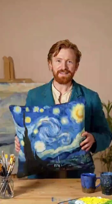 Van Gogh was holding a starry sky pillow and introducing himself in the live stream. No camera changes, no subtitles. Dear family members! Here comes the starry sky throw pillow! The pillow retains every stroke of texture I created back then. Holding it at night is like embracing the entire universe! This is not merely a throw pillow; it's an eternal starry sky that can be brought into the bedroom! Place an order now and get my autograph as a gift