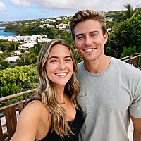 0.0-1.0 seconds: Freeze and upload the original image, with the character smiling. 1.0-2.0 seconds: Four adult women (dressed in sexy and revealing hot girl outfits) walk in pairs from both sides simultaneously. As they approach, they form symmetrical positions: two stand on either side of the original person, and the other two stand behind the original person. 2.0-2.5 seconds: All four people gently kiss the left and right cheeks and hair of the original character once (only lightly touch). 2.5-5.0 seconds: After the kiss is over, the four people remain in their current positions while gazing affectionately at the original person. The original character keeps smiling. The camera is still, and the background is clean with no special effects.