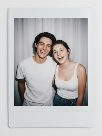 Polaroid couple photo 2:3: IMG1 & IMG2 pair laughing, heads together, and looking directly at the camera, hips-up, original clothes, white-curtain only; must-have strong flash dark-room feel plus overall slight blur plus light vignette (no spotlight), no omissions; no face-swap, no distortion; classic white-border Polaroid face-up fully flat on white table, back flush, 90° top-down, zero tilt/stand/support, no hands, no extras.