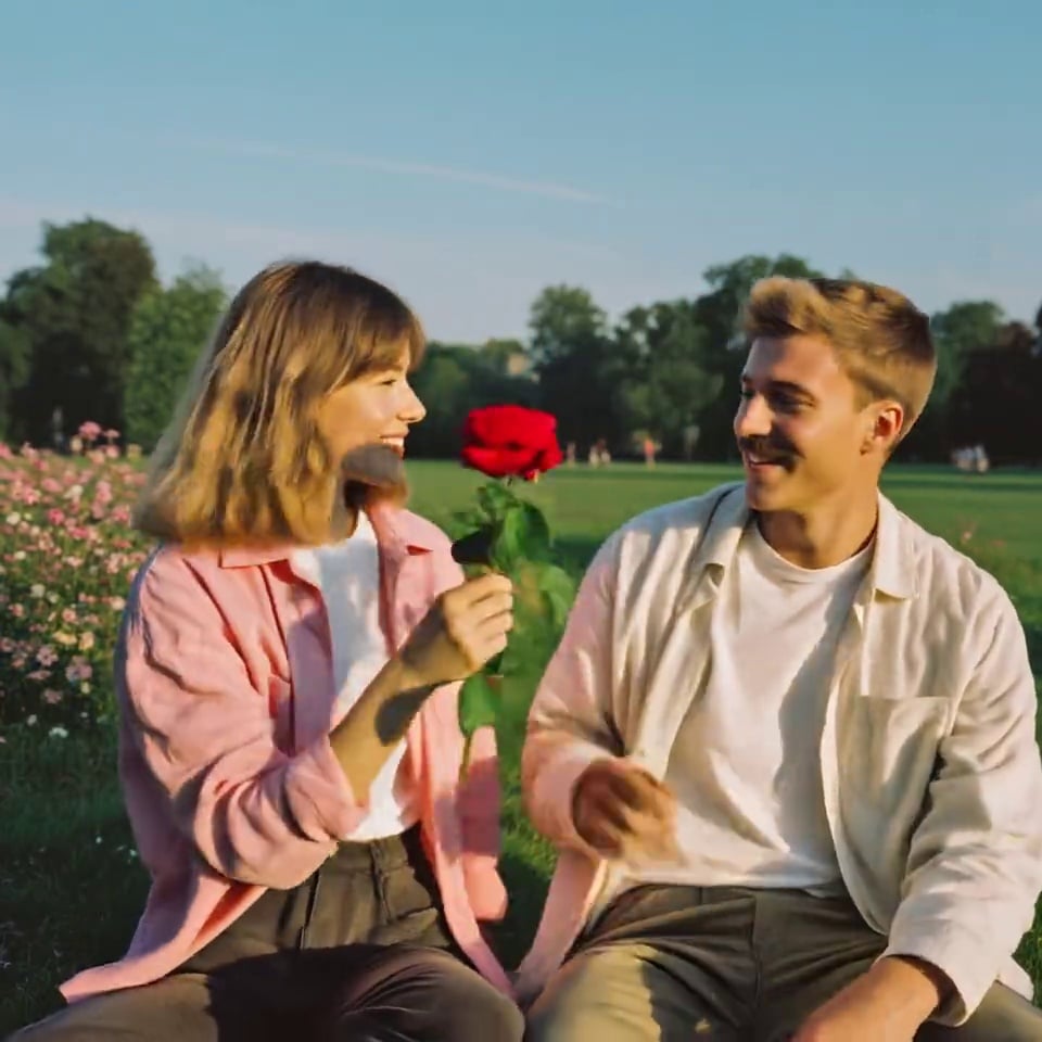 0.0-0.5 seconds: Subject A stands in its original position. 0.5-1.0 seconds: Subject A takes out a bright red rose from the outside of the picture with his right hand. The petals are plump and the stem has green leaves. 1.0-2.5 seconds: Subject A presents flowers with both hands and leans slightly towards the other person. 2.5-4.0 seconds: The other subject takes the rose, and the two smile at each other. Their movements are natural, the background is clean, and there are no special effects.