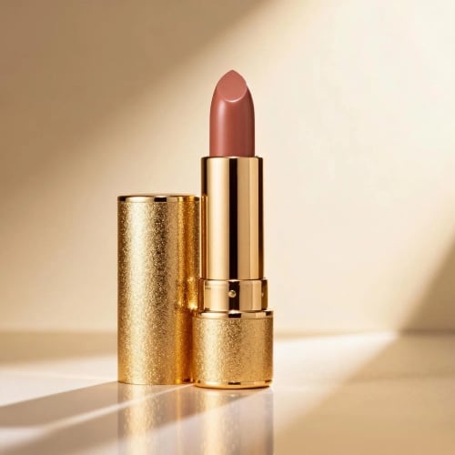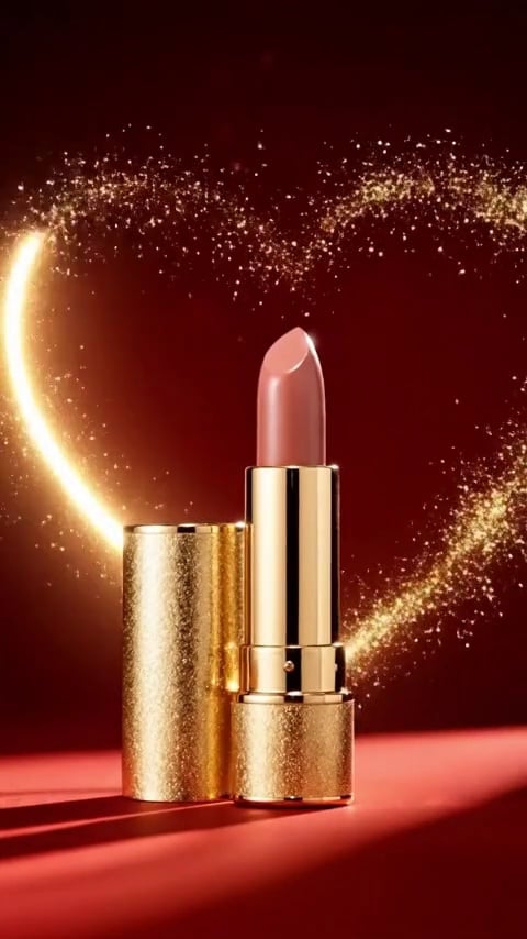 Duration: 12s | Aspect Ratio: 9:16 | Soundtrack: Soft romantic Valentine's Day instrumental (tempo elevates gently with scene progression) Shot 1 (0–1s)Cut to a high-saturation deep red matte backdrop. A lipstick (matching reference imagery) anchors the frame’s absolute center, with soft, naturally diffused lighting wrapping its form. Shot 2 (2–4s)The lipstick executes a seamless 360° rotation—camera stays fixed as the product spins smoothly, showcasing every angle of its casing. Shot 3 (4–6s · Close-Up)Transition to a tight close-up of the tube: the lipstick bullet extends ultra-smoothly at a slow pace (rising ~1/4 of its total length). The frame locks onto the bullet’s texture, highlighting its fine, even finish. Shot 4 (6–12s)Camera pulls back to frame the full lipstick (tube + extended bullet). Fine golden glitter particles bloom slowly at the frame’s core; over 1 second, they trace a fluid path to form a glowing heart outline (with a gradient CG halo along its edges). The luminous heart holds steady for the remainder of the clip.