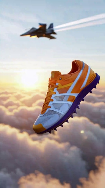 A vertical descending travel shot, cinematic style, following a user-uploaded product in free fall from the sky. The product’s pose is fully locked to the uploaded reference image and remains consistent throughout the entire video, with only minimal natural motion allowed. Camera movement in three phases: an initial rapid approach toward the product, closing in quickly; a slower, smooth approach as the product passes through dynamic, soft clouds; finally, the camera follows the product’s downward free fall, gradually slowing near the end into a brief levitation phase, without any significant change in the product’s pose. Fighter jets streak across the background at extremely high speed, with motion blur and heat trails. Realistic lighting, atmospheric depth, golden hour sky, soft sunlight and shadows on the product. Focus: sharp on product, background slightly blurred for depth. Ultra-realistic, cinematic, 4k, vertical frame, no text, no logo, no watermark.