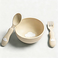 The advertisement for children's tableware features a low-saturation, soft-focus, homey style. The main subject is a 1:1 reproduction of the tableware products. A three-year-old European boy with blond hair is dressed in light yellow clothes. The scene is set in a dining room with light-colored wooden floors and warm, soft lighting. In the background, a simple sideboard is faintly visible, creating a clean and soothing atmosphere for parenting.