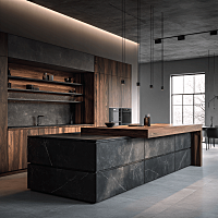 "subject": "A modern kitchen with an island and cabinetry on the left, and a rocky stream flowing through a misty, natural environment on the right.",