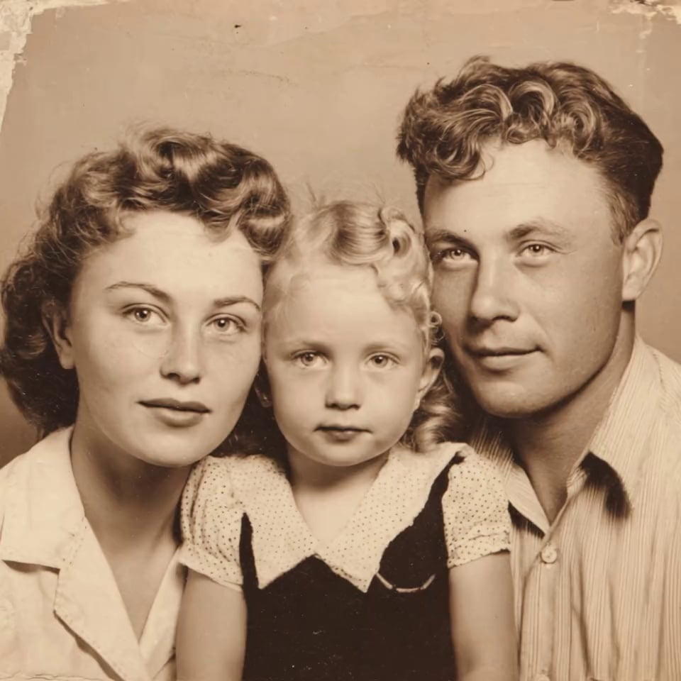 Maintain the original black and white faded texture of the old photo, without complementary colors or sharpening. The subject only made very slight breathing fluctuations in the original posture (chest 1 cm, slight eye movement), and at the same time, Subject A and Subject B naturally exchanged a glance (only made a very small eye contact, with the head almost still). The lens simulates the gentle shake of an old handheld camera: amplitude < 2°, frequency 0.5Hz, particle noise and scratches are retained. No editing, no special effects, no coloring.