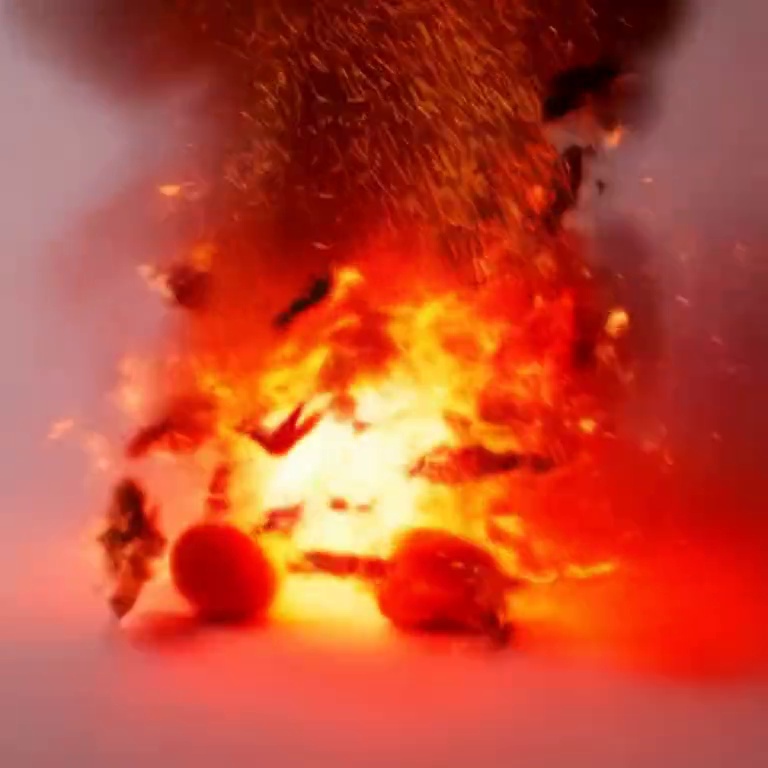 The main subject of the picture suddenly experienced a violent explosion - a flame carrying an orange-red light ball burst out from the inside of the subject, and the subject fragments, smoke and sparks instantly shot in all directions, creating a highly destructive visual impact. At the same time as the explosion occurs, the camera vibrates significantly but controllably along with the shock wave (the amplitude is sufficient to reflect the impact force but does not deviate from the main scene), and the edges of the picture can have a slight momentary blur or shake effect to enhance the sense of real presence. After the explosion, the main debris collapsed or burned in the flames and thick smoke, and the camera gradually stabilized and returned to a fixed state