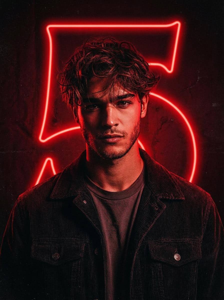 A dramatic portrait poster featuring the person from the user-uploaded image, portrayed with a serious expression in a Stranger Things–inspired aesthetic. Use dark red and black lighting, with glowing red neon lines forming a large “5” in the background. Create a cinematic, moody atmosphere with detailed facial lighting, strong red highlights, and soft directional shadows. Keep the subject wearing vintage 1980s-style clothing. Ultra-detailed, high-contrast, premium poster quality.