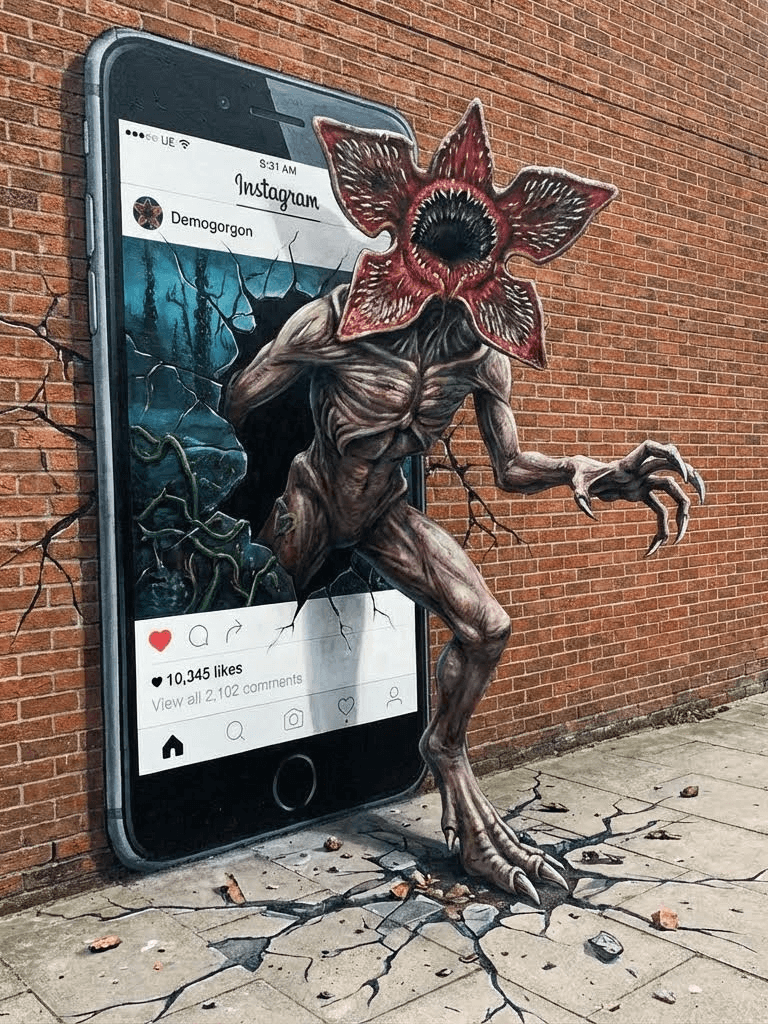 Trompe l'oeil illusion of Demogorgon steps out of a large screen displaying Instagram social media interface. The screen shows the username "Demogorgon" 10K likes, and 2K comments.