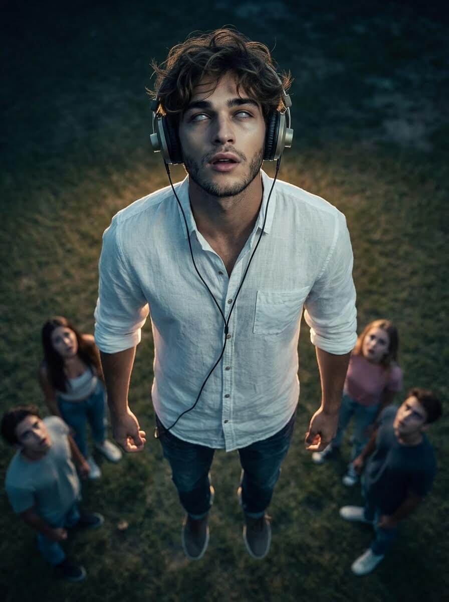 Background: a grassy outdoor area with friends or figures on the ground looking up at them, slightly blurred.