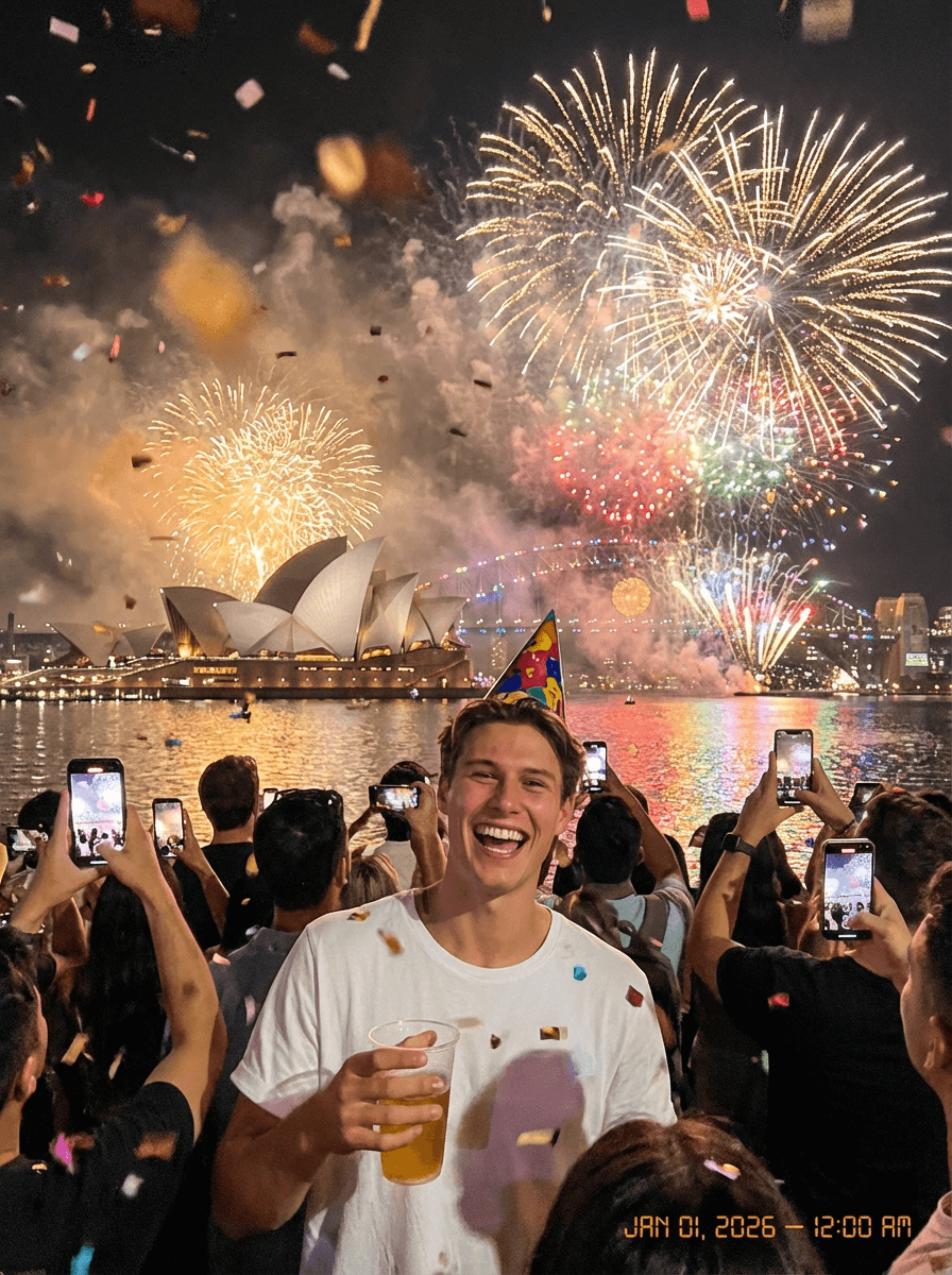 Include a small digital timestamp in the corner reading: “JAN 01, 2026 — 12:00 AM” to mimic a candid party-camera photo. The overall vibe should feel energetic, celebratory, and real — a perfect New Year’s countdown moment in Sydney.