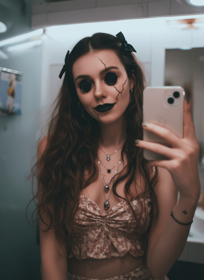 Coraline-inspired clay doll look, Halloween makeup, gothic horror style.