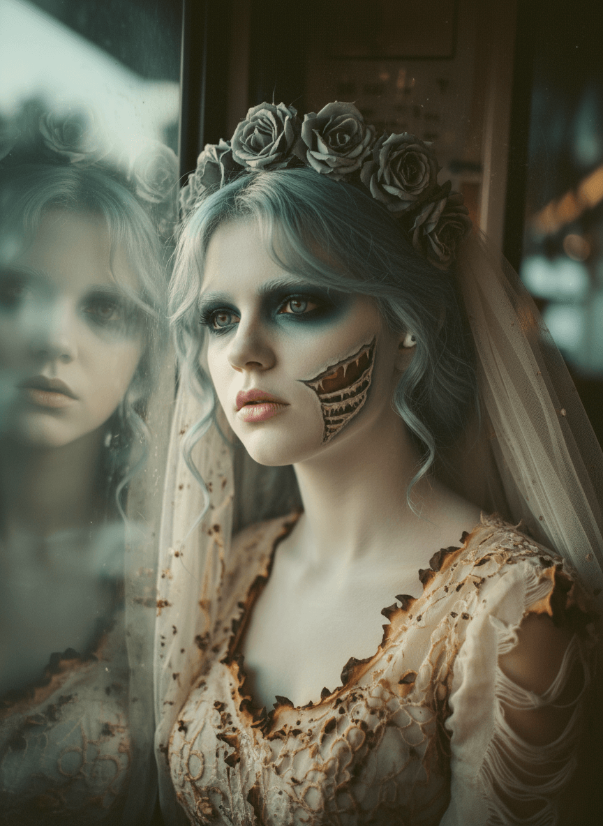 The overall look should be cinematic, emotional, and perfectly suited for a Halloween horror makeup theme.