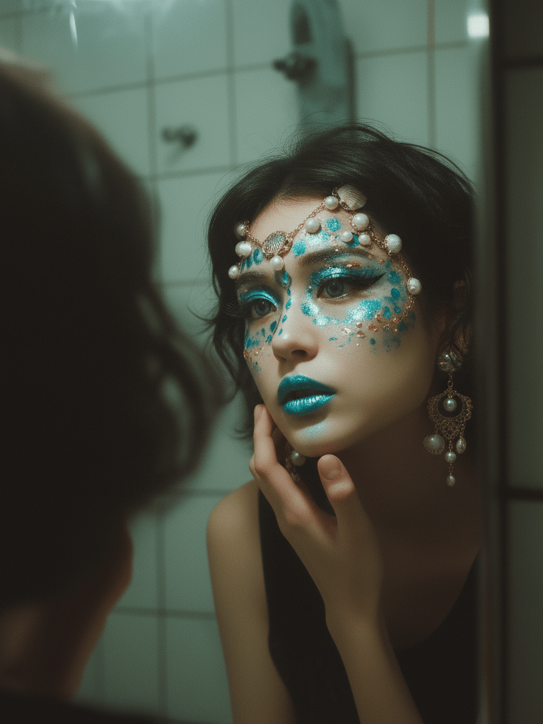 Use the same person, outfit, background, lighting, and facial features as in the reference image. Change only the makeup and accessories to a Halloween Siren/Sea Monster inspired look. Features: shimmering blue scales on the face and temples, subtle gradient blending toward the center of the face, sparkling metallic accents in gold and turquoise, dramatic ocean-inspired eye makeup, long exaggerated eyeliner resembling fins or waves, shimmering lips, mystical jewelry or shell-like adornments on the ears, small pearls and seashells as decorative accents, elegant and magical underwater theme.The person wears light blue contact lenses that make the eyes look enchanting and aquatic, small pearls placed under the eyes like mermaid tears, elegant hair accessories made of large jewels, shells, and coral, decorated with pearls and gemstones, creating a high-end fantasy deep-sea goddess style.