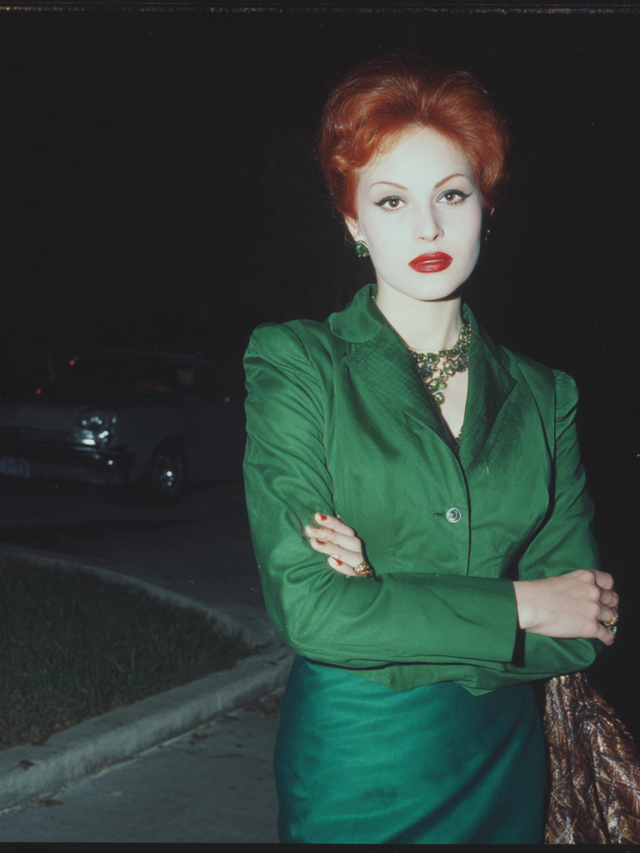Her lipstick is deep pomegranate red, almost black, giving a haunting and intense expression.