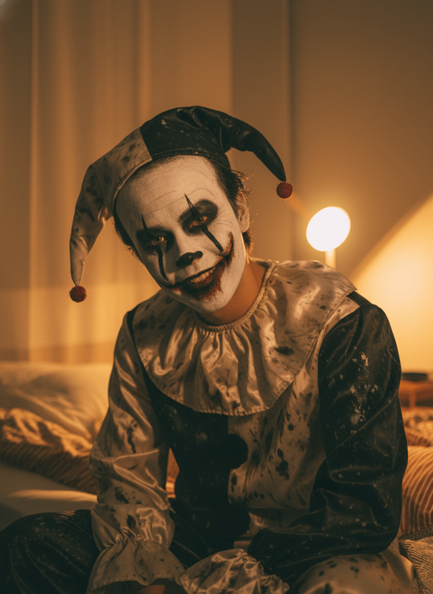 Wearing a dirty, torn red-and-white harlequin clown suit with smudges, stains, and dust.