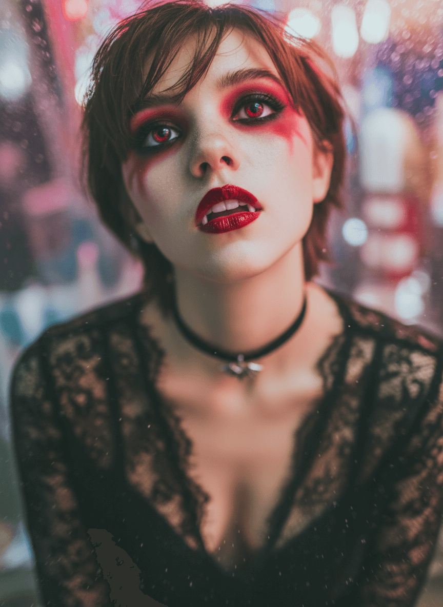 Use the same person, outfit, background, lighting, facial features and pose as in the reference image. Transform the makeup and accessories to an intense Halloween vampire-inspired style. Make the skin extremely pale and apply dark blush on the cheekbones to create a slim, sculpted face. Eyes with bold red and black eyeshadow covering the entire eyelid, black eyeshadow on the lower eyelid softly blended for a smoky effect, red contact lenses. Apply blood-red shimmery lipstick. Add prominent vampire fangs visible when mouth is slightly open. Add red accents around the face and mouth to resemble red paint sprayed for a dramatic vampire effect. Dress the person in an elegant deep V black lace dress. Hair stays natural but slightly tousled for a dark gothic look. Include subtle gothic accessories such as rings or chokers. The overall appearance should be striking, dramatic, high-quality Halloween vampire makeup, resembling a vampire from a dark fantasy scene.