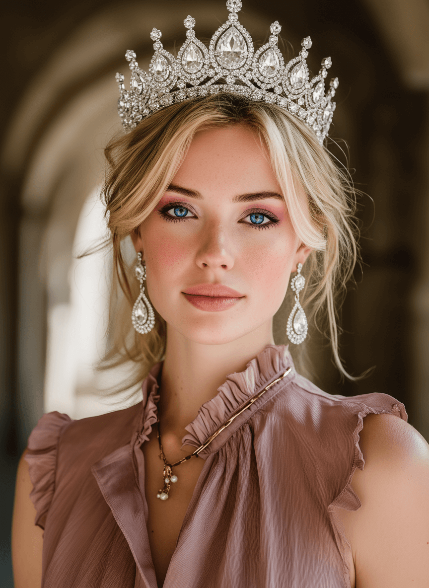 Use the person in the reference image, keep the same clothing, background, lighting, and facial features. Change only the makeup and accessories. Create a European goddess inspired Halloween makeup. Glamorous, high-end, dreamy makeup in soft pink and light blue tones. Sparkling diamond crown in the style of the British queen, very luxurious and detailed. Large luxurious diamond earrings. Eyeshadow in mauve pink with silver pearl shimmer on the center of the eyelids, creating deep, captivating eyes. Eyeliner thin and elegant, lashes long but natural. Cheeks with vivid soft pink blush and strong full pearl shimmer, glowing and radiant. Lips in glossy pastel pink, very moist and delicate. Add sapphire blue colored contact lenses. Accessories luxurious and fantasy style, ethereal glow.