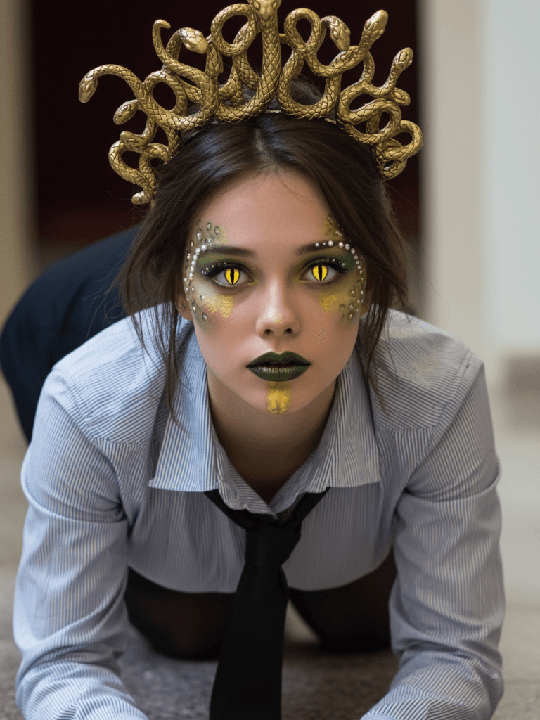 Replace only the makeup and headpiece with an artistic Medusa-inspired look in high-fashion editorial style.
