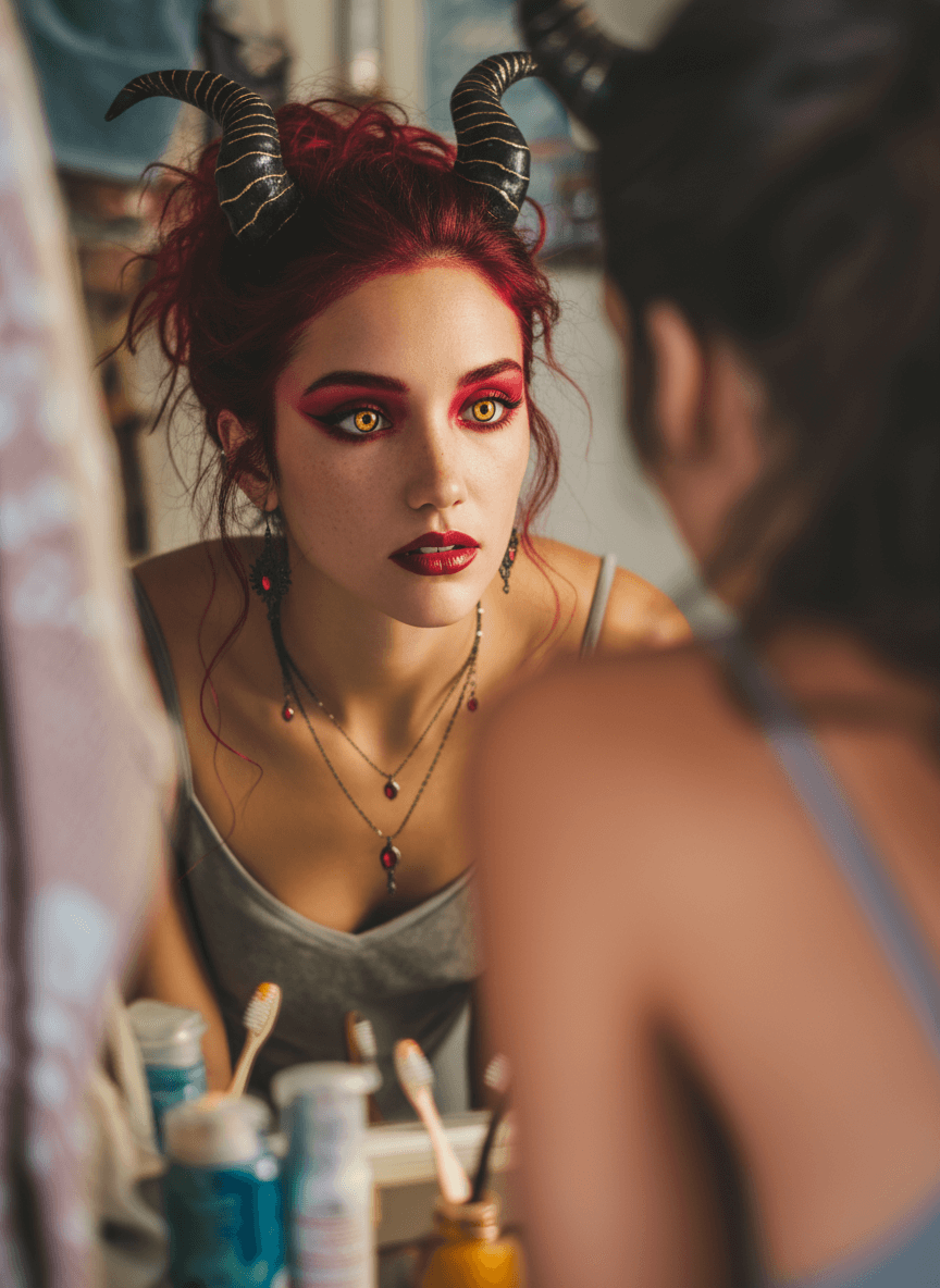 Use the same person, outfit, background, lighting, facial features and pose as in the reference image. Transform them into a "Halloween Little Demon" look. Change hair color to vivid red. Apply dramatic, high-end demon-inspired makeup: deep red eyeshadow covering the entire eyelids, prominent lower lashes, blood-red lips. Use fair, slightly pale foundation with subtle freckles across the cheeks and nose. Give the eyes golden contact lenses with black eyeliner-like outlines. Add elegant, magical demon horns on the head. Include stylish, mystical jewelry accessories. The overall look should be luxurious, mystical, and visually striking.