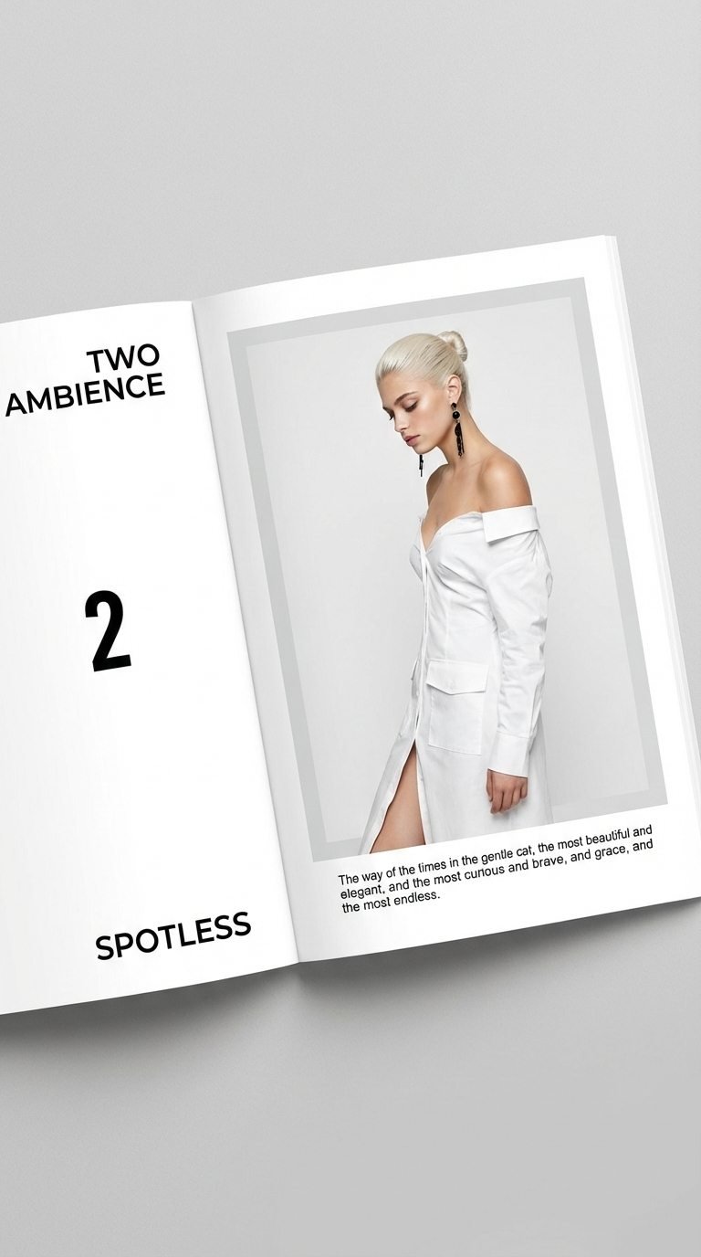 "value": "Use the uploaded image as the core content, with hairstyle and hair color referenced directly from the user’s uploaded image, depicting an open magazine spread laid flat on a light gray, matte surface, presented in a vertical 9:16 aspect ratio. The magazine is placed at a slight angle, tilted diagonally across the frame. The spread consists of two adjacent white pages: the left page features vertical black sans-serif text arranged from top to bottom—\"TWO AMBIENCE\" at the top, a bold black numeral \"2\" in the center, and \"SPOTLESS\" at the bottom—all aligned along the left edge, while the right page showcases a full-body portrait (from head to mid-thigh) of a woman as the central visual, framed by a thin light gray border against a plain light gray background within the page. The subject stands in a side-profile stance with her body slightly angled toward the camera, head tilted gently downward, gaze directed slightly below the lens with a calm, poised, and sophisticated expression, wearing polished, defined makeup with soft eye definition and a neutral lip finish, a sleek white off-the-shoulder long-sleeve shirt-dress featuring prominent front pockets and a front slit that reveals part of her leg, and accessorized with long, dangling black earrings. Below the portrait on the right page, a block of smaller black sans-serif text is left-aligned, reading: \"The way of the times in the gentle cat, the most beautiful and elegant, and the most curious and brave, and grace, and the most endless.\" All text elements are rendered in solid black, creating a clean, high-contrast look against the white magazine pages, with the text framing the portrait and complementing the minimalist, modern editorial aesthetic of the spread, ensuring the subject remains the clear focal point while maintaining a polished, professional magazine layout."
