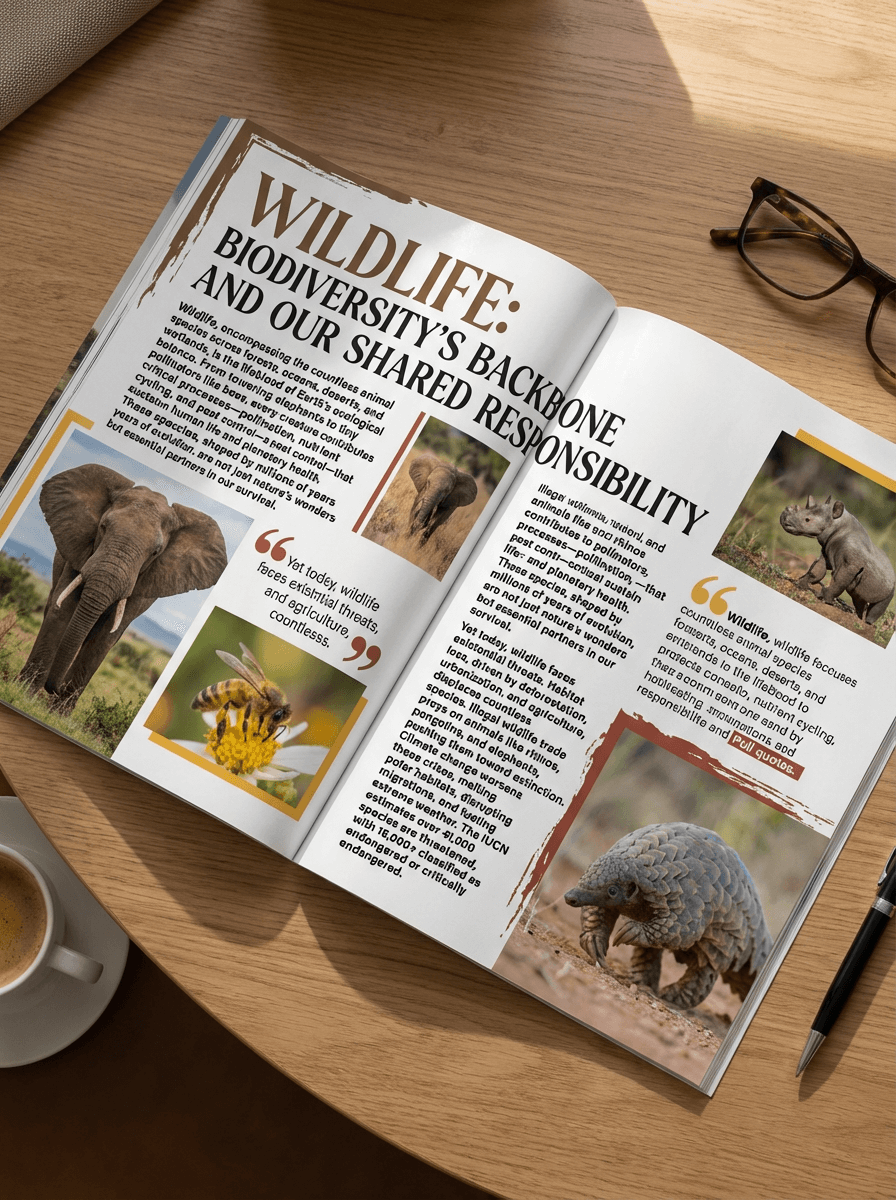 "Put this whole text, verbatim, into a photo of a glossy magazine article on a desk, with photos, beautiful typography design, pull quotes and brave formatting. The text: [Wildlife: Biodiversity's Backbone and Our Shared Responsibility.Wildlife, encompassing the countless animal species across forests, oceans, deserts, and wetlands, is the lifeblood of Earth’s ecological balance. From towering elephants to tiny pollinators like bees, every creature contributes to critical processes—pollination, nutrient cycling, and pest control—that sustain human life and planetary health. These species, shaped by millions of years of evolution, are not just nature’s wonders but essential partners in our survival.Yet today, wildlife faces existential threats. Habitat loss, driven by deforestation, urbanization, and agriculture, displaces countless species. Illegal wildlife trade preys on animals like rhinos, pangolins, and elephants, pushing them toward extinction. Climate change worsens these crises, melting polar habitats, disrupting migrations, and fueling extreme weather. The IUCN estimates over 41,000 species are threatened, with 16,000+ classified as endangered or critically endangered.]