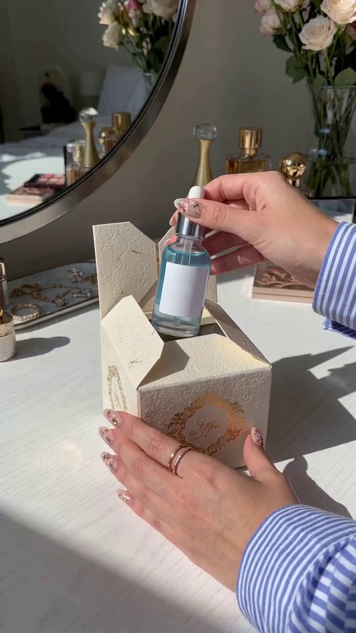 Taking the skin care products in the picture as elements, design a packaging box. The skin care products are placed right beside the packaging box, and both the packaging box and the skin care products stand on the table. The picture is mainly in light green tones, with a solid background and a high-end texture.