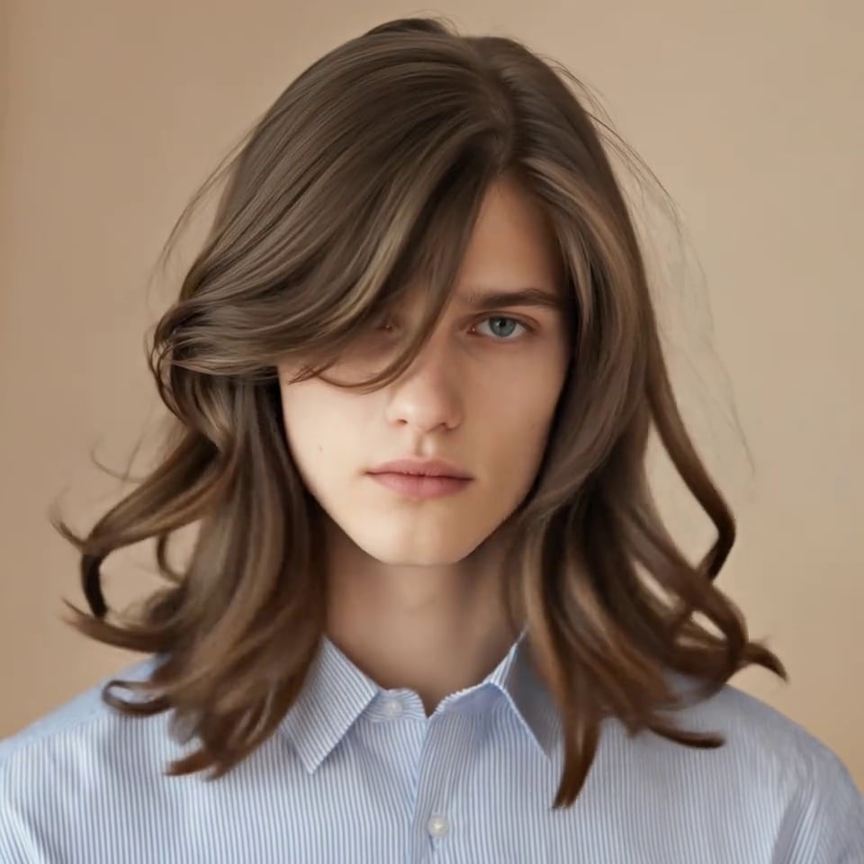 The head remained completely still. Instantly, a 1-meter-long, smooth hair burst out from the top of the head (with the same color as the original hair). The hair strands did two slow-motion rebounds on both sides of the head before smoothly falling down to the shoulders. The bangs were pushed aside to the sides, revealing the complete facial features. The background remains unchanged and the camera is locked